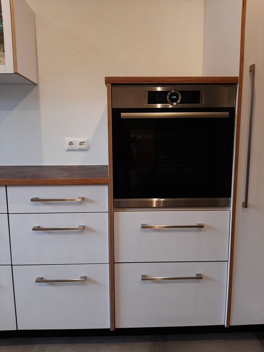 Bei der Sanierung einer bestehenden Einbauküche durch neue Schranktüren, neuer Arbeitsplatte, Beschlägen und zusätzlichen Schubladen entsteht ein neues modernes Design.